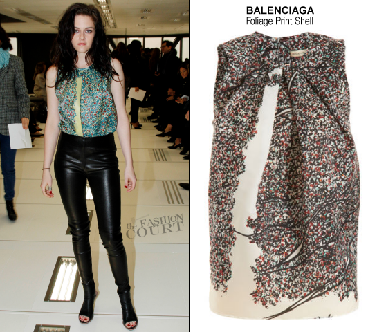 K.Stew rocked Balenciaga‘s black leather high-waist leggings with a seam at the knee, a slinky green foliage print shell top from the Resort 2012 collection and a pair of black leather slingback open toe “Tube” sandals. Looks like she took out her Snow White extensions as she had it out today and styled in medium length tousled waves.