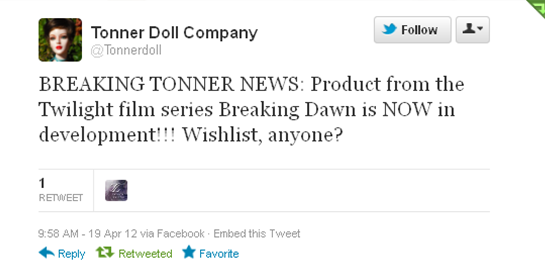 Other Twilight based dolls have been retired. They just tweeted out the below information asking for suggestions for a Breaking Dawn line.
